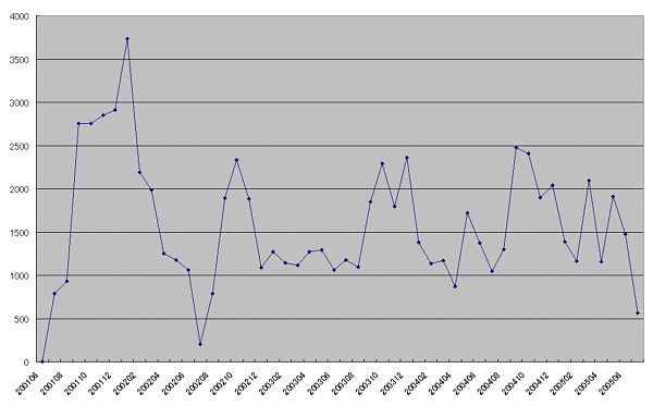 早速データを取ってグラフ化してみた。大体月に1000〜2500ファイル位のペースで登録している。また、やはり夏競馬あたりは登録数が少 なくなるみたいです。大体思っていた感じだな